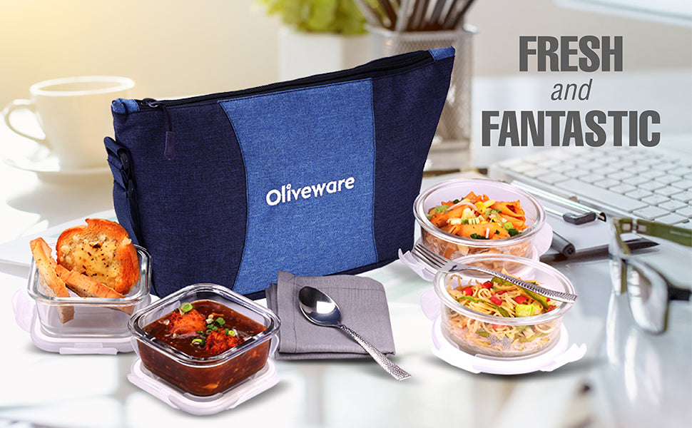 Included Components: 4 Glass Containers, 1 Lunch Bag, 1 Set of Steel Spoon & Fork, 1 Napkin